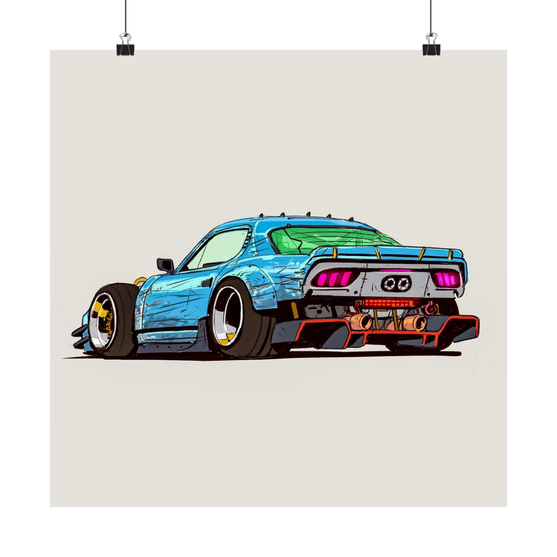 The cool blue body contrasts with vivid taillight tones and subtle mechanical accents, creating a piece that feels alive even at a standstill. It’s gritty without being chaotic — clean illustration with heavy motorsport attitude.